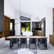 This industrial style home is 2317 square feet with 5 bedrooms and 5 baths. A beautiful rustic color palette of browns and black complete with a poured concrete floor. A lineal wooden overhang drops down from the main floor ceiling to the basement. This artistic wall separates the restful sleep space from the active living, dining and kitchen area. The large kitchen is complete with a 2 tier table and counter height island with plenty of room for prep. You will find the garage in the back with a drive down ramp tucked neatly on the basement level of the home. On this level there is also a large laundry room with storage, an innovative laundry shoot and a lot of counter space. The huge developed basement provides space for a large rec room, another bedroom with an ensuite bath as well as a finished office.